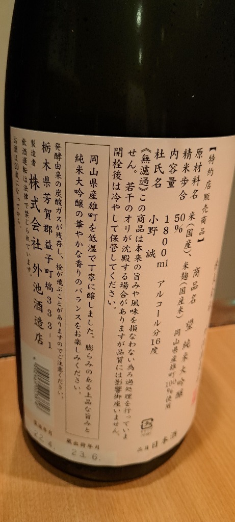 高いレベルで安定したお酒を造る蔵として個人的にも信頼している外池酒造店さんの望シリーズ。